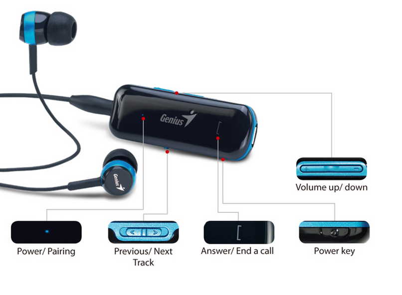 (31710166100) Genius HS-905BT Bluetooth stereo headset for music and calls, volume control, Stereo mini jack; Music Playing Time: up to 6 hours; Answering/ending calls, Play/Pause, Volume up/down, Next/Prev. track; 3 sizes ear pieces, Black/Blue
