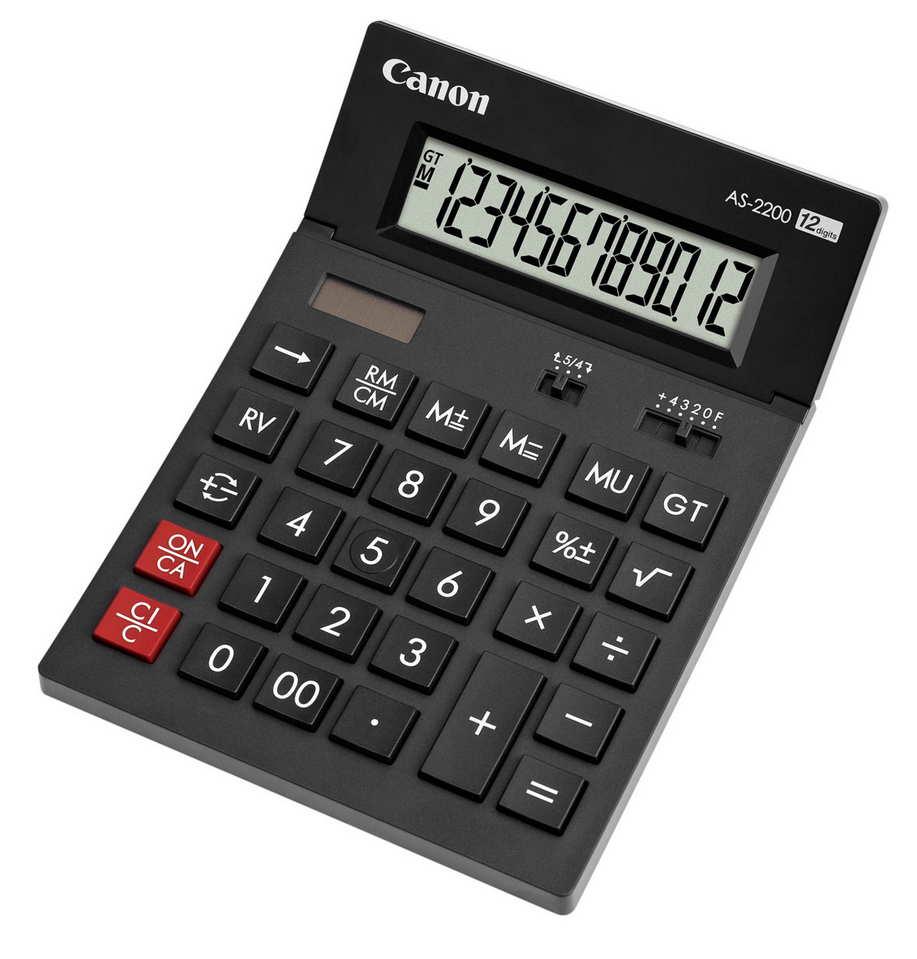 Calculator Canon AS-2200, Black, 12 digit , Large LCD (91.5x23.8mm), Character Size (18.5x6.01mm), Adjustable (2-level) Display, Double Independent Memory, Command Signs, Auto-power Off, Power (Solar and battery LR44), Size 198x140x34mm, Weight 212g