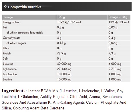 Коробка 20 мешков (10 г / саше) BCAA Сжатие растворимый напиток формулируется в новой манере и практики. Это растворимый напиток с аминокислотами в 4: 1: 1 (L-лейцин, L-изолейцин и L-валин). Дополнение обогащается L-глутамина, белкового обмена высказывания. Он также восстанавливает запасы гликогена. Быстрое поглощение гарантируется суд растворимости добавки. Это дополнение рекомендуется спортсменов и активных людей,, ускоряя восстановление мышц. Высокое содержание аминокислот с разветвленной цепью - 6000 мг на порцию Отлично растворимость в воде Без сахара Он содержит L-глутамин НАПРАВЛЕНИЯ BCAA NUTREND СЖАТИЕ 4: 1: 1 РАСТВОРИМЫЙ НАПИТОК Порция 10 г. Развести 10 г в 200 мл воды. Пить за 15 минут до тренировки, во время или сразу после тренировки. Внимание! Не превышайте максимальную рекомендуемую дозу! Продукт является пищевая добавка и не должны заменять разнообразное питание и здоровый образ жизни. Этот продукт противопоказан дети, беременных или кормящих женщин! Хранить в прохладном, сухом месте при температуре не выше 25 ° С Хранить в недоступном для детей месте!