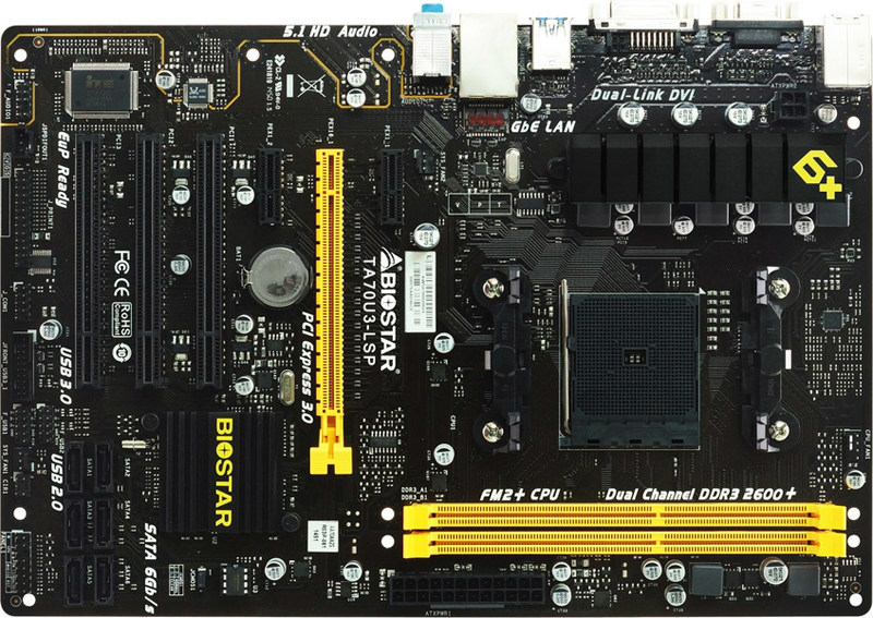 Biostar TA70U3-LSP, Socket FM2/FM2+, AMD A70M, Dual 2xDDR3-2600, APU AMD graphics, DVI, 1xPCIe X16, 6xSATA3(6Gb/s), RAID, ALC662 5.1ch HDA, GigaBit LAN, 4xUSB3.0(5Gb/s), 100W, ATX