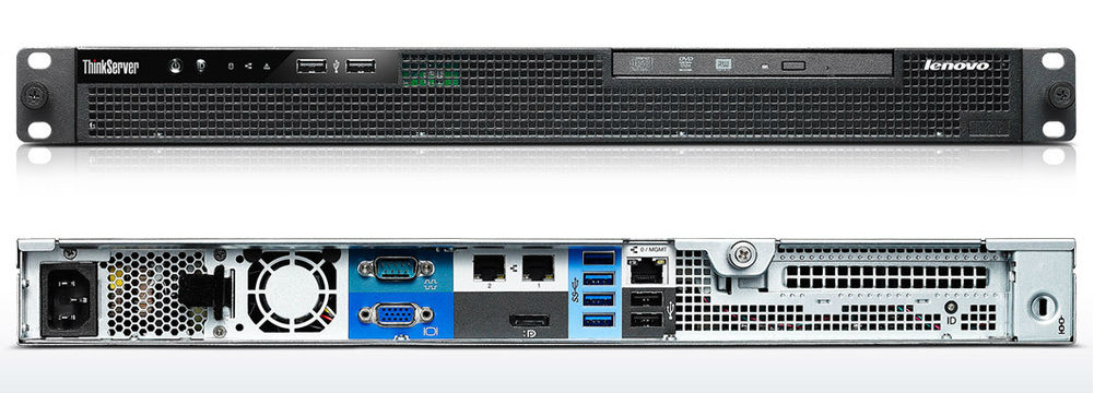 Lenovo ThinkServer RS140 w/ 2 x3.5" Bays, Xeon E3-1226v3, 1 x 4Gb ECC UDIMM, RAID100 0/1/5/10 w/ No Cache, No HDD, Slim DVD-RW, 1GbE 2-port Onboard and 1GbE for Mgmt, No TPM, No Intrusion Switch, Intel AMT 9.0, 1 x 300W PSU Fixed, Rack 1U
