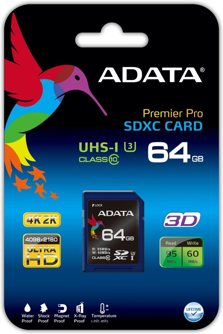 64Gb Premier Pro SDXC/SDHC UHS-I U3 Class10, ADATA Class10, Waterproof, Shockproof, Magnetproof Тип карты памяти Secure Digital XC Класс скорости Class 10 Поддержка UHS UHS Class 3