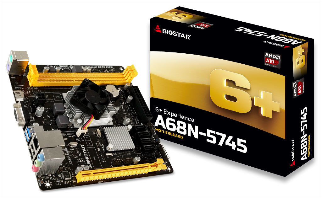 Biostar A68N-5745, MB + CPU onboard: Quad-core AMD A10-5745 (2.1-2.9GHz), 2xDDR3-1600, AMD Radeon HD8610G Graphics, HDMI, 1x PCI-Ex16, 4xSATA3, RAID, COM Header, Realtek ALC887 8-Ch HD Audio, Gigabit LAN, 4xUSB3.0(5Gb/s), mini-ITX