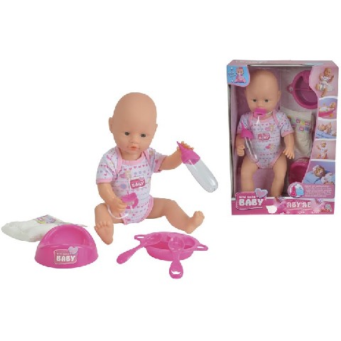 Simba papusa NBB bebelus si funct. 38 cm Simba Пупс "New Born Baby" 38 см С помощью этого замечательного пупса Ваша малышка научится заботиться о своих близких и ухаживать за малышами. Ему необходимо давать соску, чтобы он успокоился и, если не успели высадить на горшок, вовремя менять мокрые пеленки. Руки, ноги и голова у куклы поворачиваются. В набор включены: Kукла, горшок, бутылка, тарелка с ложкой и вилкой, пустышка, подгузник. Высота куклы: 38 см Рекомендуемый возраст: от 3 лет