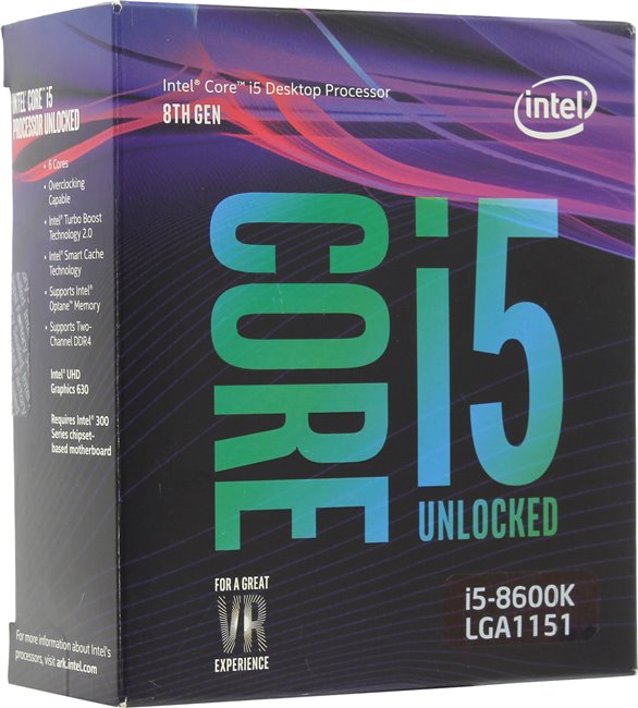 CPU Intel Core i5-8600K Unlocked 3.6-4.3GHz Six Cores, Coffee Lake (LGA1151, 3,6-4.3GHz, 9MB, Intel UHD Graphics 630) BOX (procesor/процессор) Только для материнских плат на Z370! Новый процессор Intel Core i5-8600K 8-го поколения, с кодовым названием микроархитектуры Coffee Lake. Предназначен для настольной платформы Intel LGA 1151. Принадлежит к семейству высокопроизводительных процессоров Core i5. Intel Core i5-8600K производится по стандарту 14-нм техпроцесса, имеет 6 ядер, которые работают в 6 потоков со штатной тактовой частотой 3.6 ГГц, 4.3 ГГц в режиме Turbo Boost. Объем кэш-памяти 3 уровня равен 9 МБ. Имеет 2-х канальный контроллер памяти DDR4. Особенности: Встроенное графическое ядро нового поколения Intel UHD Graphics Ultra HD 4K – наслаждайтесь удивительным и динамичным видео на ваших Ultra HD и 4K дисплеях (разрешение до 4096 х 2304) Intel Quick Sync Video дает отличную возможность видеоконференций, быстрого преобразования, редактирования и авторизации видео, а также онлайн обмена Встроенный DirectX 12 API обеспечит наилучшие впечатление от игр и графики Технологии защиты: Intel Advanced Encryption Standard Instructions Intel Secure Key Intel OS Guard Внимание! Процессор поставляется без системы охлаждения. Семейство процессора Intel Core i5 Тип разъема Socket 1151 Поколение процессора Intel Coffee Lake (восьмое) Количество ядер 6 Интегрированная графика Intel UHD Graphics 630 Внутренняя тактовая частота 3600 МГц Разблокированный множитель Да Частота шины данных 8 ГТ/с Тип упаковки BOX Количество контактов 1151