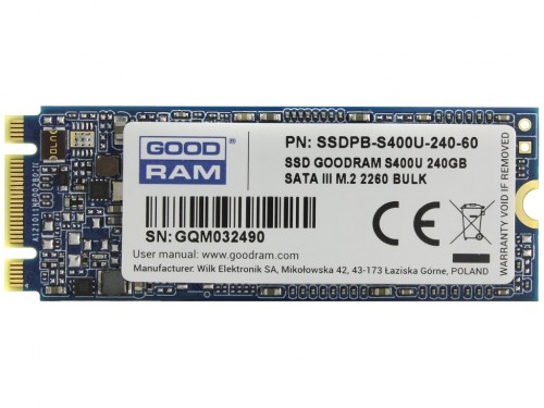 M.2 SATA SSD 240GB GOODRAM S400U, Interface: SATA 6Gb/s, M.2 Type 2260 form factor, Sequential Reads: 550 MB/s, Sequential Writes: 530 MB/s, Controller Phison S11, NAND TLC, Retail