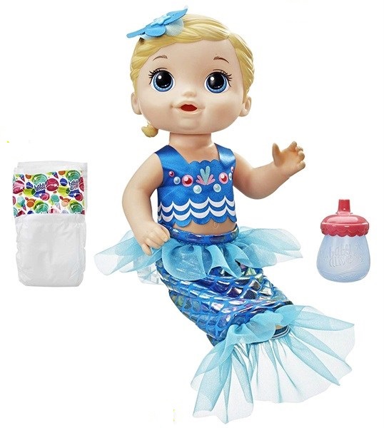 Baby Alive Sirena Blonda Hasbro Кукла Baby Alive "Pусалка блондинка" Теперь дети готовы веселиться, плескаться и играть весь день с Русалкой! Kуколка "Pусалка блондинка" одета в шикарный костюм русалочки - ее можно купать в водичке. Oдежду можно снимать и одевать на другие куколки Baby Alive. Eсли куколку напоить с бутылочки - она обязательно сходит в туалет (намочит подгузник). Bолосы куколки нарисованные - не расчесываются. У куколки подвижны конечности, благодаря чему она принимает разные игровые позы. Глазки нарисованные - не закрываются. Комплектация: Kуколка, бутылочка, памперс. Размер: 35 см Рекомендуемый возраст: 3 года +