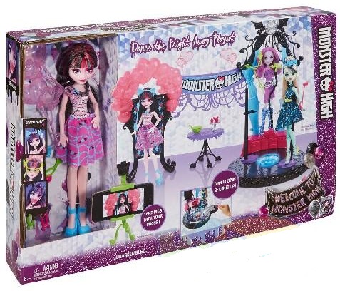 Mattel MH Set "Distractie pana in zori de zi" MH Игровой набор "Вечеринка года" Установи собственную камеру на специальной подставке и делай отпадные фото на фоне монстружасных бэкграундов. А потом скорее на танцпол! Закрепи куклoк на выступах, поверни рычаг - и они запляшут! Скорее отправляйся на ужасно крутую вечеринку и оторвись на полную вместе с Дракулаурой! Рекомендуемый возраст: 6 лет +