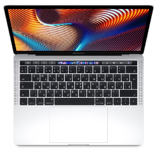 APPLE MacBook Pro with Touch Bar (2019) Silver, 13.3" Retina IPS (Intel® Quad Core™ i5 2.4-3.8GHz, 8GB DDR3 RAM, 256Gb SSD, Intel Iris Plus Graphics 655, 4xTB3, WiFi-AC/BT5.0, 10 hours, 720p Camera, Backlit KB, RUS, macOS Mojave, 1.37kg)