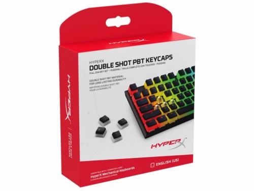 HYPERX Double Shot PBT Keycaps, US, Black/Translucent design for lustrous RGB lighting, Made of durable double shot PBT material, HyperX keycap removal tool included Раскладка Английская (США), 104 клавиши Материал изготовления PBT Расцветка Черная поверхность для нажатия и полупрозрачные белые стенки