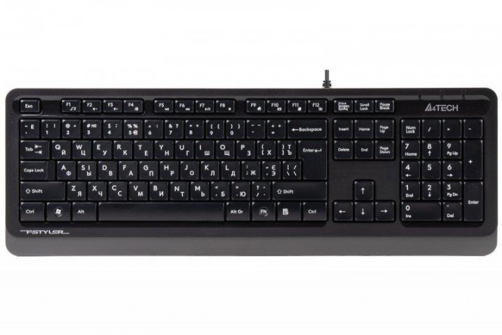 Keyboard A4Tech FK10, Multimedia Hot Keys, Laser Inscribed Keys , Splash Proof, Black/Grey, USB проводная клавиатура интерфейс USB для настольного компьютера классическая конструкция, мембранная клавиш: 104 размеры (ШxВxГ): 456x24x156 мм вес: 534 г.