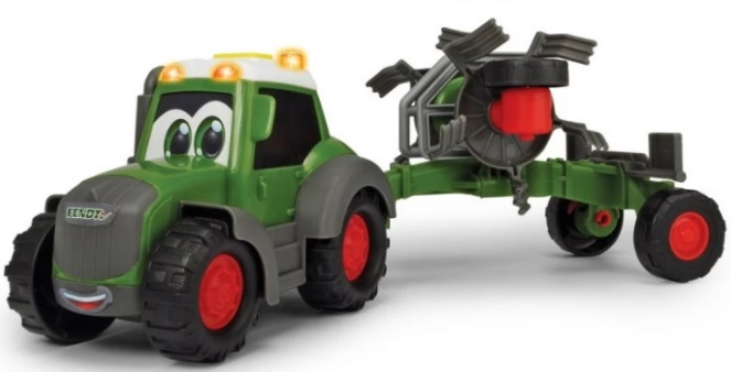 Dickie auto "Happy Fendt Tedder"sun & lum Трактор Happy Fendt с ворошилкой для сена 30 см, свет, звук Трактор «Happy Fendt» с ворошилкой для сена от германской компании «Dickie Toys» - отличный подарок. Игрушка имеет безопасную для малыша форму с округлыми углами, подвижные элементы, световые и звуковые эффекты, позволяющие малышу познакомиться с принципами ее работы. Размер игрушки: 30 см Комплект: трактор, ворошилка Питание: 2 x LR44 (батарейки тестовые в комплекте) Возраст: от 1 года