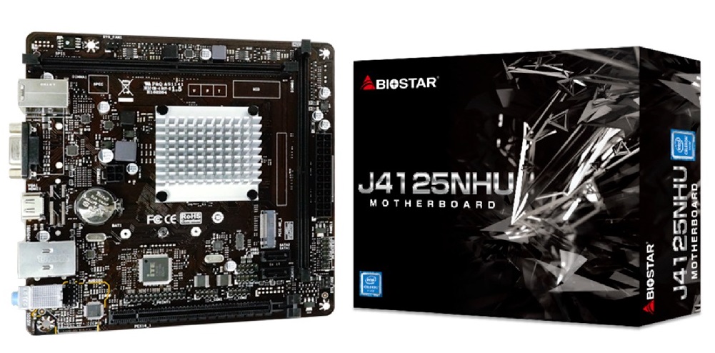 BIOSTAR J4125NHU, MB + CPU onboard: Quad-core Celeron J4125 4C/4T(2.0-2.7GHz), Dual 2xDDR4-2400 (up to 8GB), Intel UHD Graphics 600, VGA, HDMI, 1xPCIe X16, 2xSATA3, 1xM.2 Slot, Realtek ALC887 HDA, COM & LPT Headers, 1xGbE LAN, 2xUSB3.2, 6xUSB 2.0, Mini-IT