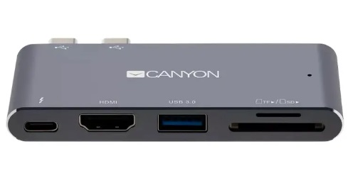 Docking Station Canyon DS-5, 5-in-1, 1xThunderbolt 3, 1xUSB 3.0, 1xHDM, 1xSD, 1xTF Интерфейс: USB Количество портов: 5 Передача данных: 40 Гбит Материалы: Алюминий HDMI: 1x HDMI 4K Видеовыход USB/Thunderbolt: 1x Thunderbolt 3 Слоты для карт памяти: SD, MicroSD