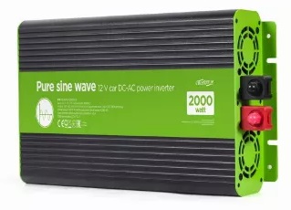 EnerGenie EG-PWC-PS2000-01, 12 V Pure sine wave car DC-AC power inverter, 2000 W, with USB port / 5V-2.1A, Input: 10-16 VDC (accumulator directly) - Output: 230 VAC +/- 10% at 50 Hz (+/-1Hz), pure sine wave, THD < 3%, 90% efficiency