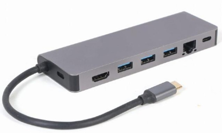 Gembird A-CM-COMBO5-05, USB Type-C 5-in-1 multi-port adapter (Hub + HDMI + PD + card reader + LAN), 3-port USB 3.1 Gen 1 (5 Gbps) hub, 4K HDMI, Gigabit LAN port, SD card reader and 100 W USB Type-C Power Delivery port, durable premium style metal housi