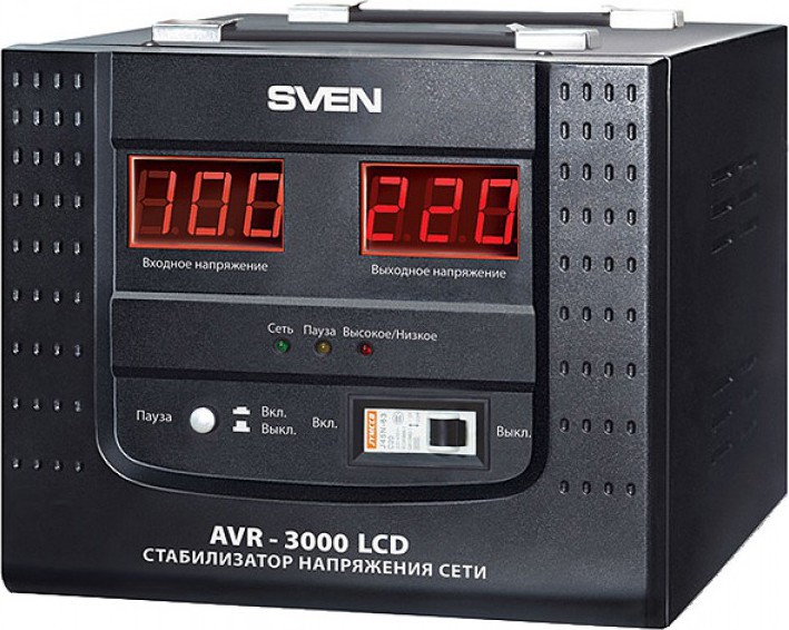 SVEN AVR-3000 LCD, 3000VA /2100W, Automatic Voltage Regulator, 1x Schuko outlets, Input voltage: 100-280V, Output voltage: 220V ± 8%, digital indicators of input and output voltage on the front panel, Pause function