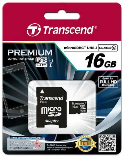 16GB MicroSDHC (Class 10), SD adapter, UHS-I, 300X, Transcend "TS16GUSDU1" Premium (R/W:90/20MB/s)