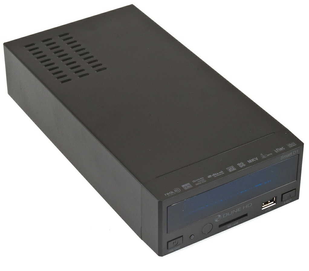 Dune HD Smart D1, HD-MediaPlayer, SD8642/8643, Display, Full HD, Support 3.5" HDD SATA, 1920x1080dpi, AVI, XViD, MPEG-4, LAN, eSATA, USB, CardReader, Dune HD Smart D1 является полноценным универсальным медиапроигрывателем, позволяющим воспроизводить видео стандартной и высокой чёткости. вплоть до Full HD (1080p), а также может быть использован в качестве основы (базового устройства) для построения собственной модификации плеера при помощи добавления к нему опциональных модулей расширения, выпускаемых для семейства Smart. Комплектация без HDD Поддержка HD 1080p (Full HD) Количество мест для HDD 1 Поддержка HDD 3.5", SATA Поддержка файловых систем EXT2, EXT3, FAT16, NTFS Форматы файлов MKV, AVI, WMV, ISO, VOB, MOV, ASF, TS, M2TS, MP4 Кодеки MPEG2, MPEG4, XviD, H.264, WMV9, AVCHD, VC1 Аудиофайлы MP3, WMA, AAC, Ogg, PCM, M4A, WAV, FLAC, APE, AC3, DTS Графические файлы JPEG, GIF, BMP, PNG Поддержка субтитров SRT (external), SUB (MicroDVD) (external), text (MKV), SSA/ASS (MKV, external), VobSub (MP4, MKV, external SUB/IDX), PGS (Blu-ray, TS, MKV) Выходы аудио стерео, аудио оптический, видео композитный, видео компонентный, HDMI 1.3 Интерфейсы USB 2.0 Type A x3, USB 2.0 Type B, Ethernet, eSATA Host Скорость Ethernet 10/100 Мбит/с Поддержка карт памяти Secure Digital, Secure Digital HC Подключение по Wi-Fi опционально Менеджер закачек BitTorrent, HTTP, FTP Функции поддержка IPTV, FTP-сервер, UPnP Дисплей есть Пульт ДУ есть Название процессора/чипсета Sigma Designs SMP8642 Размер оперативной памяти 512 Мб Размер Flash-памяти 128 Мб Блок питания внешний Интернет-сервисы есть Поддержка онлайн-сервисов Интернет Радио Размеры (ШxВxГ) 142x65x276 мм Вес 1.9 кг Дополнительная информация опция Digital TV; возможность подключения модулей расширения Smart BE (Blu-ray привод), Smart HE (HDD-бокс, подключаемый по USB или eSATA, USB-разветвитель), Smart ME (два отсека для плат расширения с функциями DVB-T/T2, DVB-S/S2 и DVB-C)