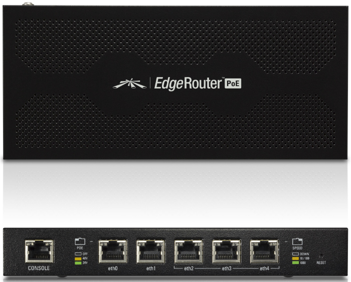 Ubiquiti EdgeRouter ERPoe-5, Dual-Core 500 MHz MIPS64, 512MB DDR2 RAM, 2GB Flash Storage, 3 Gbps, 100000 pps, 5 x 10/100/1000 Mbps Ethernet ports, 1 RJ-45 serial console, OSPF, IPv6, Firewall, NAT, VPN, DHCP, VLAN, 24V or 48V PoE port output, Max. 50W