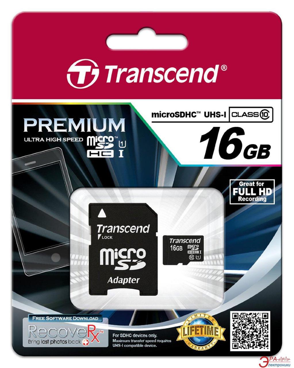 16GB MicroSDHC (Class 10), SD adapter, UHS-I, 600X, Transcend "TS16GUSDU1" Ultimate (R/W:90/45MB/s)