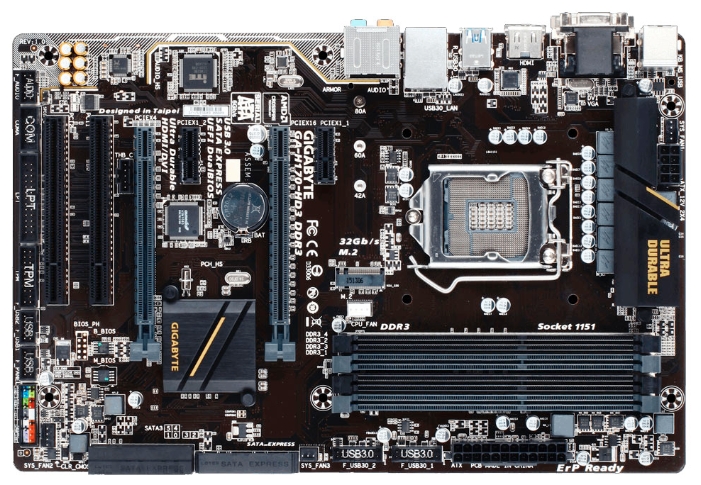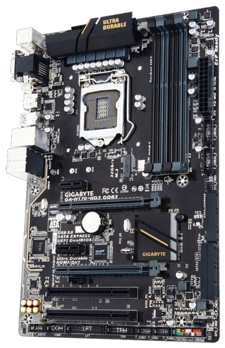 "MB S1151 Gigabyte GA-H170-HD3 DDR3 1.0 (Intel H170, ATX) 4xDDR3(DDR3/DDR3L 1866 O.C./ 1600 / 1333 MHz memory modules),DVI,VGA,HDMI,PCI-Ex.16x2,(16x/4x),PCIEx1x2,PCI x 2,6xSATA 6GB/s,1x M.2,2 x SATA Express,6xUSB 2.0,8xUSB 3.0, 1xGbit LAN,Audio 8ch (Rea