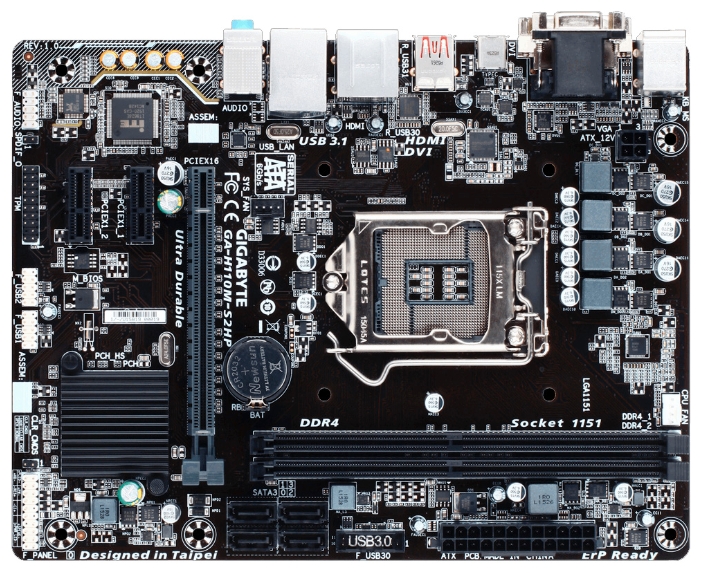 GIGABYTEGA-H110M-S2PHDDR3,Socket1151,Intel®H110,Dual2xDDR3-1600,CPUIntelgraphics,HDMI,1xPCIeX16,4xSATA3,2xPCI,1xPCIeX1,1xCOM,1xLPT,ALC8877.1chHDA,GigabitLAN,4xUSB3.0,mATX