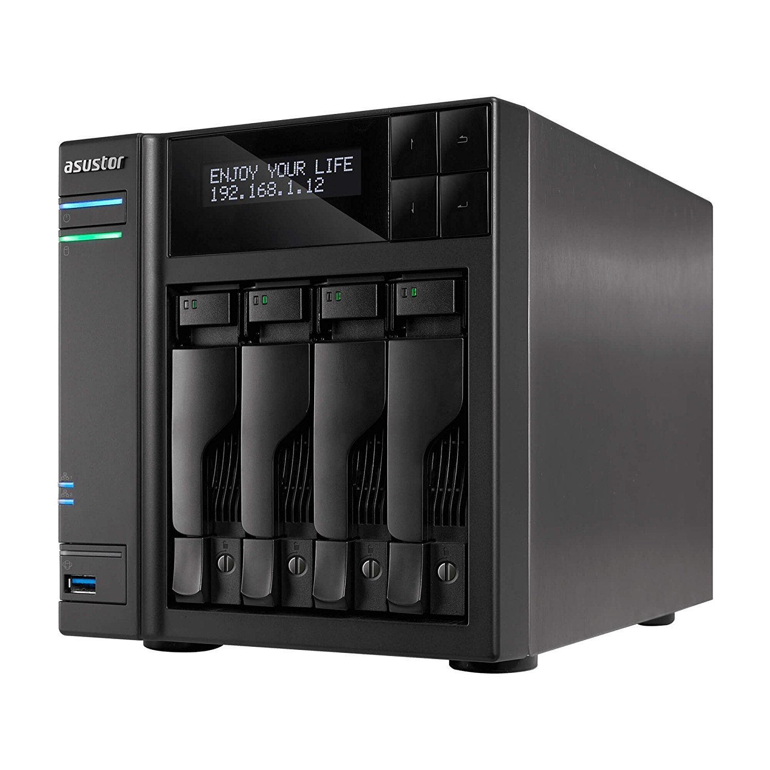 4-bay NAS Server ASUSTOR "AS6404T", Intel Celeron J3455 (Quad-Core) 1.5-2.3GHz, 8GB DDR3L(4GB x2), 2.5"/3.5"SATA x4 (Hot Swap), LCD Panel, USB3.0 x4 (Type A x3, Type C x1), Gigabit LAN x2, HDMI, S/PDIF, AES-NI, HT, IR, Surveillance: <36 (4 Free)