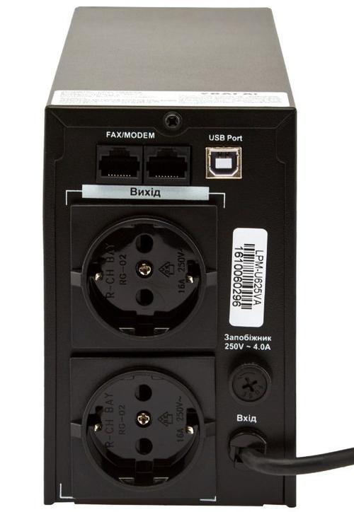 LogicPower LPM-U825VA, Line-interactive UPS, 825VA / 577W, AVR, 2x Schuko outlets, USB, RJ-11, AVR: 145-290V, Battery: 12V/9 AH x 1, Cold start function, Metal case, Black