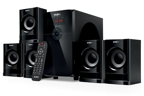 SVEN HT-201 Black, 5.1 / 20W + 5x12W RMS, Bluetooth+EDR, FM-tuner, USB & SD card Input, Digital LED display, built-in clock, remote control, all wooden (sub.5.3" + satl.3.2")