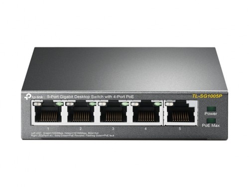 ".5-port Gigabit Switch TP-LINK ""TL-SG1005P"", with 4-Port PoE, steel case 5 10/100/1000Mbps RJ45 ports With four PoE ports, transfers data and power on one single cable Working with IEEE 802.3af compliant PDs, expands home and office network 802.1p/