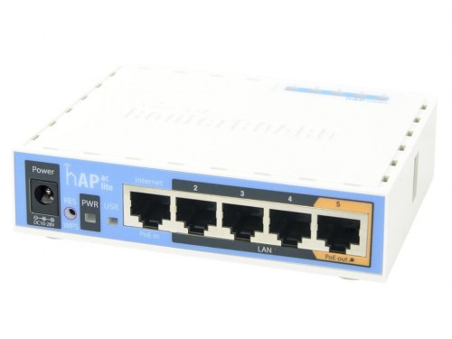 MikroTik RouterBOARD hAP ac lite, Dual Band Wireless Router, 2.4GHz Dual + 5GHz, AP/Bridge/Station/WDS, 802.11b/g/n/ac, 1 WAN+4 LAN, USB port for 3G/4G modem, 2xinternal antennas, Wireless chip QCA9887 650MHz, RAM64MB, PoEin, PoEout, RouterOS ЛПГ ac lite является точка доступа Dual одновременно, что обеспечивает охват WiFi для 2,4 ГГц и 5 ГГц частот в то же время. Прибор оснащен 650 МГц процессор, 64 МБ ОЗУ, пять портов Ethernet 10/100 Мбит/с (PoE вывода на порт #5), двойной цепь 802.11b/g/n беспроводной 2,4 ГГц, одной цепи 802.11a/n/ac 5 ГГц беспроводные, USB-порт для модема 3G / 4G и лицензию RouterOS L4. У нас есть две версии - RB952Ui-5ac2nD-US (США) и RB952Ui-5ac2nD (Международный). RB952Ui-5ac2nD-США (США)-фабрика заблокирован для 2412-2462 МГц, 5170-5250 МГц и 5725-5835 МГц частот. Эта блокировка не может быть удален. RB952Ui-5ac2nD (Международный) поддерживает 2412-2484 МГц и 5150-5875 МГц диапазона (конкретные частотный диапазон может быть ограничена правилами страны).