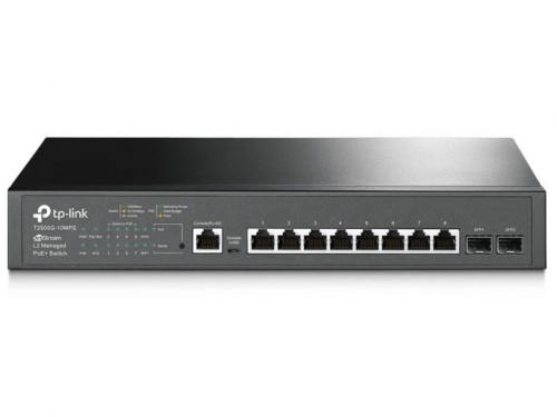 ".8-port Gigabit Managed PoE+ Switch, TP-LINK ""T2500G-10MPS"", with 2 SFP Slots , steel case Features 8 PoE+ ports compliant with 802.3af/at, 116W total PoE power output and an array of PoE management options Gigabit Ethernet connections on all ports