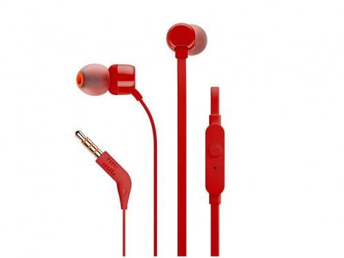 JBL T110 / In-ear headphones with microphone, Dynamic driver 9 mm, Frequency response 20 Hz-20 kHz, 1-button remote with microphone, JBL Pure Bass sound, Tangle-free flat cable, 3.5 mm jack, Red Тип Вставные (Вакуумные) Микрофон Есть Интерфейс подключения Jack 3.5