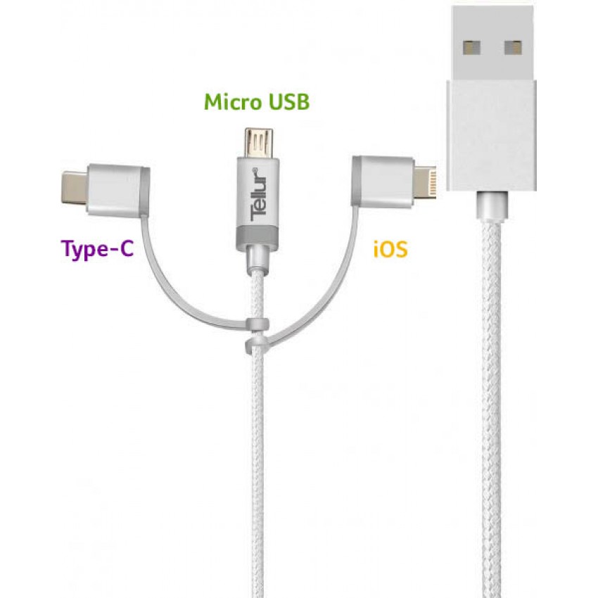 Cablu de date Tellur 3 in 1 USB - microUSB+ adaptor lightning + adaptor Type-C nylon 1m, argintiu