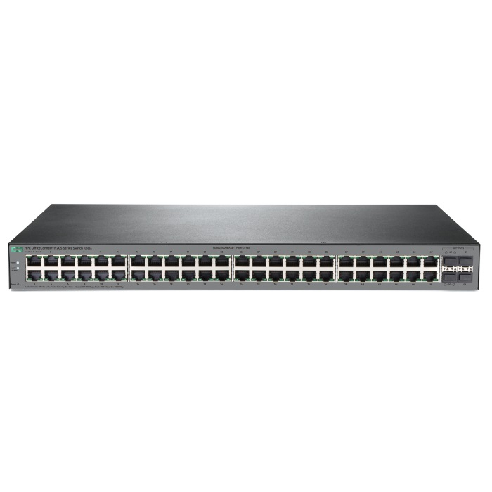 HPE 1920S 48G Switch, 4SFP, 48-port RJ-45 10/100/1000 ports, Layer 3 static routing, 4-SFP 100/1000 Mbps ports, VLANs, IGMP Snooping, link aggregation trunking, DSCP QoS policies STP/RSTP