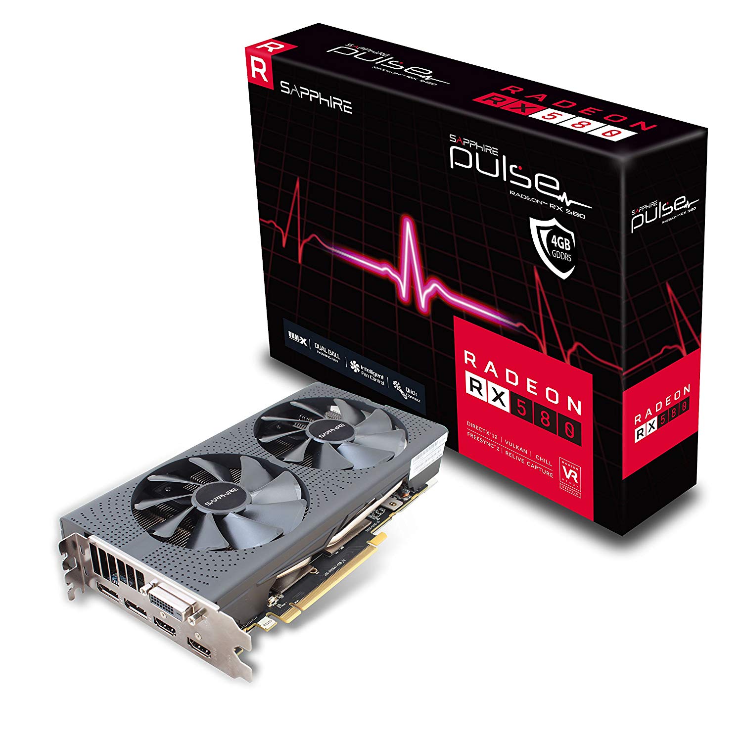 Видеокарта Sapphire PULSE Radeon RX 580 4GB GDDR5 256Bit 1366/7000Mhz, DVI-D, 2x HDMI, 2x DisplayPort, Dual-X fans (Two ball bearing), Intelligent Fan Control (IFC-III), Lite Retail видеокарта AMD Radeon RX 580 4096 МБ видеопамяти GDDR5 частота ядра/памяти: 1366/7000 МГц поддержка SLI/CrossFire разъемы DVI, HDMI, DisplayPort x2 поддержка DirectX 12, OpenGL 4.5, Vulkan работа с 5 мониторами