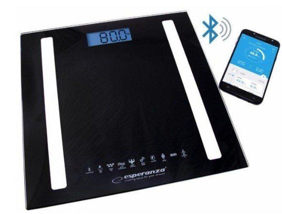 Bluetooth Scale ESPERANZA 8in1 EBS016K Black, measurement: body weight [kg], body fat content [%], water content in the body [%], muscle weight [kg], bone weight [kg], visceral fat index, body mass index (BMI), identification of the optimal calorie inta