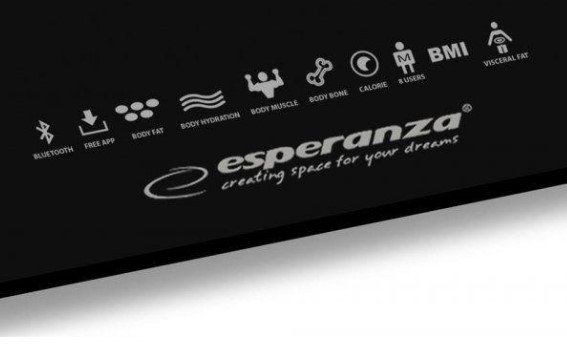 BluetoothScaleESPERANZA8in1EBS016KBlack,measurement:bodyweight[kg],bodyfatcontent[%],watercontentinthebody[%],muscleweight[kg],boneweight[kg],visceralfatindex,bodymassindex(BMI),identificationoftheoptimalcalorieinta