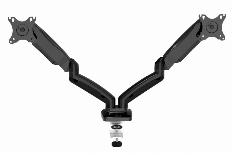 Table/desk stand for 2 monitors Gembird MA-DA2-01, 13"-27", max.7kg, VESA: 75x75, 100x100 - https://gembird.nl/item.aspx?id=10676 Надежный стальной настольный кронштейн для 2х ЖК дисплеев Штанга вращается, выдвигается, наклоняется для настройки угла и позволяет поворачивать дисплей на 90 градусов и т.п. Позволяет эргономически размещать экран, избегая напряжения Подходит для большинства телевизоров или мониторов с размером экрана до 27 дюймов Мощная газовая пружина позволяет держать устройства до 7 кг Прочная струбцина для крепления конструкции на краю стола Совместим со стандартами VESA 100 x 100 мм и 75 x 75 мм
