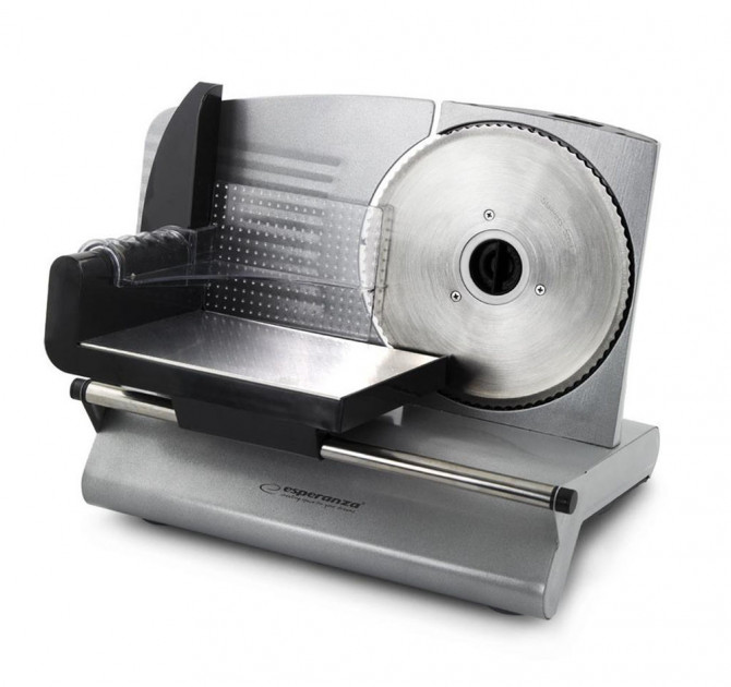 Food Slicer ESPERANZA MORTADELLA EKM018K 150W, Slicing thickness - 0 - 15 mm, Maximum uninterrupted working time 5 minutes, Break-up time before next use - 30 minutes, Noise of device (LWA): 75 dB/A, Blade material - stainless steel, Blade diameter – 19