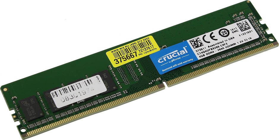 4GB DDR4-2666 CRUCIAL, PC21300, CL19, 1.2V Объем 4 GB Тип комплекта Single Stick Тактовая частота 2666 МГц CAS Latency (CL), нс 19 Тип памяти DDR4