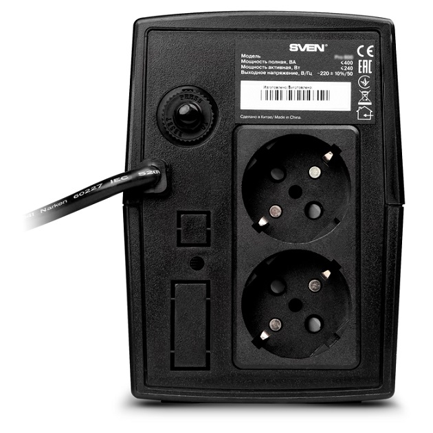 SVEN Pro 400, Line-interactive UPS, 400VA /240W, 2x Schuko outlets, 1x7AH, AVR: 175-280V, Cold start function, Black 1-фазное входное напряжение выходная мощность 400 ВА / 240 Вт выходных разъемов: 2 разъемов с питанием от батареи: 2 время зарядки 8 ч