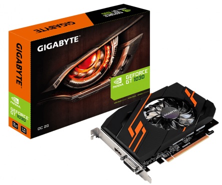 VGA Gigabyte GT1030 2GB GDDR5 OC GeForce® GT 1030, 2GB GDDR5, 64 bit, Engine 1290/1544MHz (OC Mode), Memory 6008MHz, Active Cooling, DVI-D *1, HDMI-2.0b *1 Графический чип GeForce GT 1030 Объем памяти: 2 ГБ Разрядность шины памяти 64 бит Тип памяти GDDR5 Тип системы охлаждения Активная