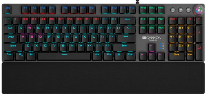 Gaming Keyboard Canyon Nightfall, Mechanical, Black SW, Anti-ghosting, Backlight, Macros, Wrist rest проводная клавиатура интерфейс USB для настольного компьютера, игровая классическая конструкция, механическая клавиш: 108, дополнительных: 4 размеры (ШxВxГ): 435x38.50x123 мм вес: 990 г