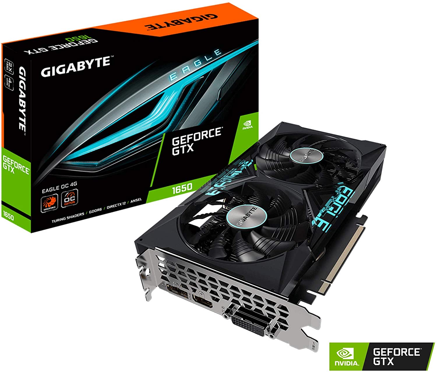 "VGA Gigabyte GTX1650 D6 4GB GDDR6 Eagle OC // GeForce® GTX 1650 D6, 4GB GDDR6, 128 bit, Engine 1590/1815MHz, Memory 12000MHz, Active Cooling (2x fans), DisplayPort 1.4 *1, HDMI 2.0b *1, DVI-D *1, Power 6 Pin*1 https://www.gigabyte.com/Graphics-Card/GV