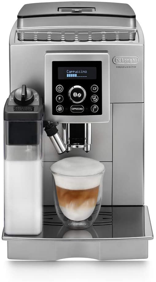 Кофемашина Delonghi ECAM23.460S, Power output 1450W, water tank capacity 1.8l, suitable for coffee beans and coffee powder, pre brew system, hot water function, double height-adjustable coffee spout, cup warmer, LED display, pump pressure 15 bar, CAP автоматическая, 15 бар для зернового и молотого кофе кофемолка с регулировкой степени помола контроль крепости кофе настройка температуры регулировка порции воды приготовление капучино настройка времени старта отключение при неиспользовании одновременная раздача на 2 чашки дисплей корпус из пластика