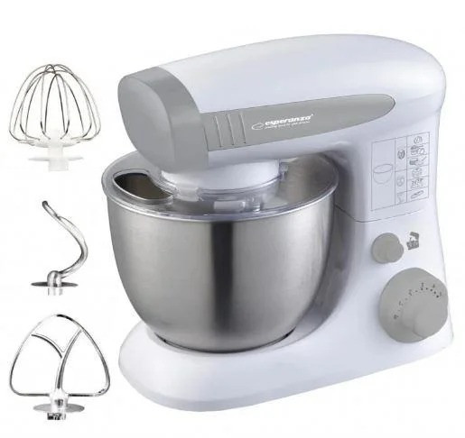 Food Processor Esperanza COOKING ASSISTANT 800W ; Protection class: I; Power consumption: 800 W; Stainless steel bowl capacity: 4L; 6 Speeds with Pulse function; Continuous operation time with normal load: 12 minutes ; Cool down time before next usage: На современной кухне хозяйка вряд ли обойдется без кухонной машины. Кухонный комбайн Esperanza EKM024 взбивает, перемешивает, замешивает. Вы сможете взбивать различные соусы и кремы с помощью насадки венчик. С помощью насадки крюк Вы сможете просто за считанные минуты замесить мягкое и эластичное тесто. С помощью лопаток Вы сможете быстро смешать необходимые продукты. Блендер имеет компактные размеры, но при этом обладает высокой мощностью в 800 Вт, а также имеет 6 режимов скоростей. Мощность: 800 Вт; Материал чаши: нержавеющая сталь; Емкость чаши: 4 л; 6 скоростей с пульсирующей функцией; Время непрерывной работы при нормальной нагрузке: 12 минут; Время охлаждения перед следующим использованием : 20 минут; Нескользящие прорезиненные ножки; Защита от перегрузки; Защита от брызг; Длина шнура 1 м; Размеры: 36.5 x 30.5 x 21 см. Комплектация: Чаша; Брызгозащитная крышка; Венчик для пышного теста; Мешалка для теста средней вязкости (биттер); Крючок для замеса теста; Лопатка.