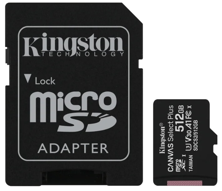 512GB Kingston microSD Class10 UHS-I U1 V10 A1 + SD adapter Canvas Select Plus, Up to: 100MB/s