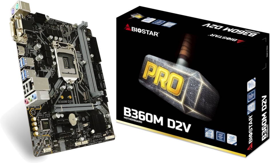 Материнская плата Biostar B360M D2V, Socket 1151, Intel® B360 (9th/8th Gen CPU), Dual 2xDDR4-2666, CPU Intel graphics, VGA, DVI, HDMI, 1xPCIe X16, 6xSATA3, 1x M.2 slot, 2xPCIe X1, ALC 887 7.1 HDA, GbE LAN, 6xUSB3.1, mATX